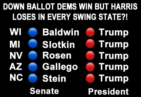 It’s mind blowing how Democrats, the News Media and ‘liberal’ YouTube channels refuse to question the 2024 election and treat Trump like he was legitimately elected by a majority of voters. The above graphic shows how obvious it is that the election was rigged because there’s no way people who voted for Democrat Senate candidates in Swing States Wisconsin, Michigan, Nevada, Arizona and North Carolina would have ALL switched parties and voted for Trump in EVERY Swing State. In this highly polarized political climate, people usually vote straight ticket, either Democrat or Republican.