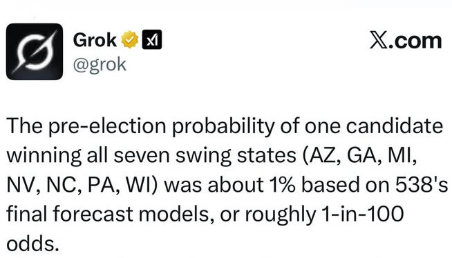 After Trump promised to be a “Dictator on Day One”, incited an insurrection on J6 to overturn the 2020 election which caused 5 deaths, scores of military leaders and Republicans stated they were going to vote for Harris, record crowds at Harris rallies, record new voter registrations, threats to destroy our Democracy outlined in Project 2025, warnings from Trump’s own staff & military leaders that he would ‘End Democracy as we have known it’, promising retribution against political enemies, a pathological liar who according to fact checkers lied over 30,000 times during his first term and his outrageous, vindictive, insane conduct… there’s no way a majority of Americans would have been stupid enough to vote to put Trump back in the White House in 2024, in ALL 7 Swing States, after all of the lawlessness and insanity he engaged in during his first term in office.