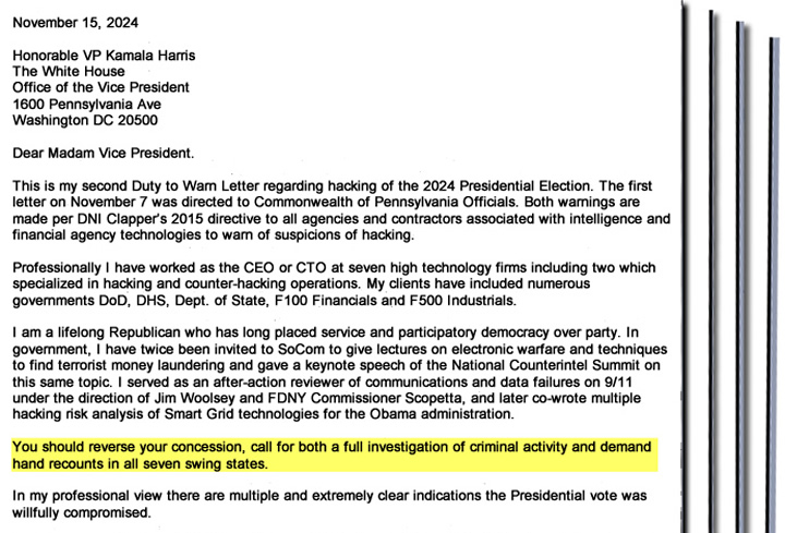 • Cyber Security Experts sent letters to Kamala Harris on 11-13-24 & 11-15-24 in which they claimed the 2024 election may have been hacked & urged her to demand Recounts in Swing States, stating; “You should reverse your concession, call for both a full investigation of criminal activity and demand hand recounts in all seven swing states”.