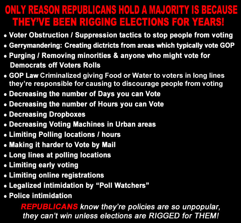 Republicans have a history of Voter Suppression, Voter Obstruction, Voter Purges, Voter Challenges, Gerrymandering and other unscrupulous anti-democratic tactics to rig elections.