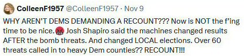Posts all over social media such as #Recount2024 show Americans knew something was drastically wrong, but Kamala Harris, Democrats, the Mainstream News Media and a large portion of the population accepted the results without asking any questions and have continued legitimizing Trump’s Presidency by failing to discuss or speak out about any of the issues which were apparent after the election was called for Trump.