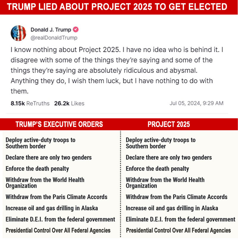 • Trump lied to get re-elected by saying; “I know nothing about Project 2025”. Since taking office, he’s been checking off the list with his executive orders and hired people who were directly involved in formulating Project 2025. Since Trump lied to get elected, he defrauded the American people and therefore obtained the Presidency by fraud and deception.