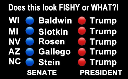 The above graphic shows how obvious it is that the 2024 election was rigged because there’s no way people who voted for Democrat Senate candidates in Swing States Wisconsin, Michigan, Nevada, Arizona and North Carolina would have ALL switched parties and voted for Trump. In this highly polarized political climate, people usually vote straight ticket, either Democrat or Republican.
