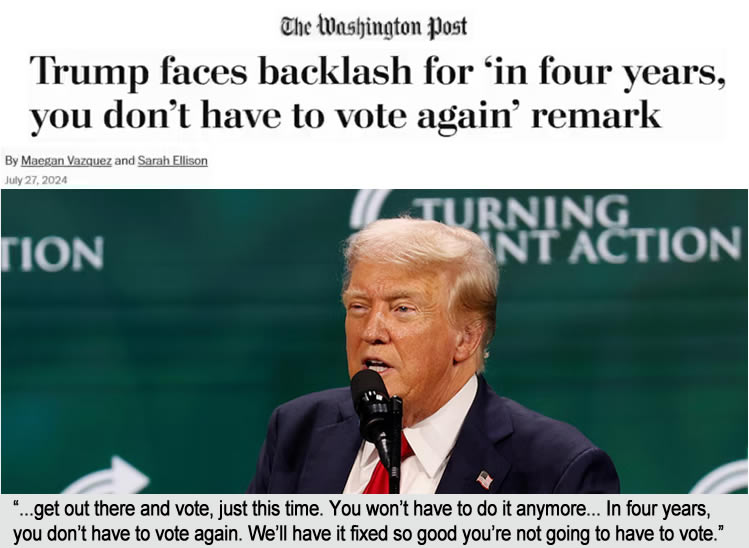 • Trump admitted the 2024 election and future elections will be rigged when he said “I don’t need your votes”. “Get out and vote just this time…. you won’t have to do it anymore… we’ll have it fixed so good, in four years you don’t have to vote again”.