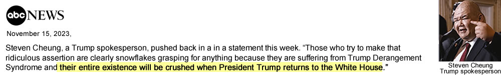 In response to outrage over Trump’s ‘vermin’ comment, his campaign spokesperson Steven Cheung stated about Trump opponents; “their entire existence will be crushed when President Trump returns to the White House.”