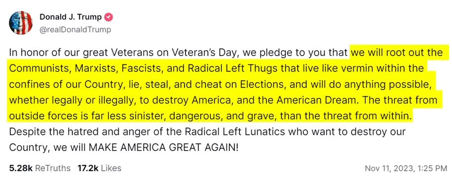 On Veterans Day, November 11, 2023 Trump stated; ”We pledge to you that we will root out the communists, Marxists, fascists and the radical left thugs that live like vermin within the confines of our country that lie and steal and cheat on elections”.