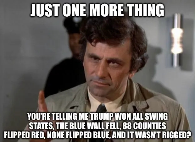 We struggled to understand how a 34-count convicted felon—who couldn’t fill a stadium and doesn’t know that asylum is a homonym—somehow outperformed Reagan, flipping 88 counties red while not a single one flipped blue. It felt improbable. So, we did what anyone would do in the face of statistical absurdity: we started digging and ran the numbers.