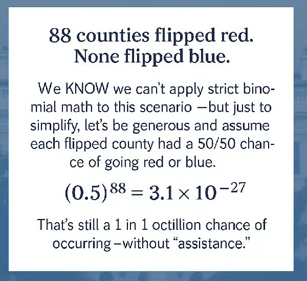88 counties flipped red. None flipped blue. Trump swept every swing state—each just above the mandatory recount thresholds. What are the odds? About one in never.