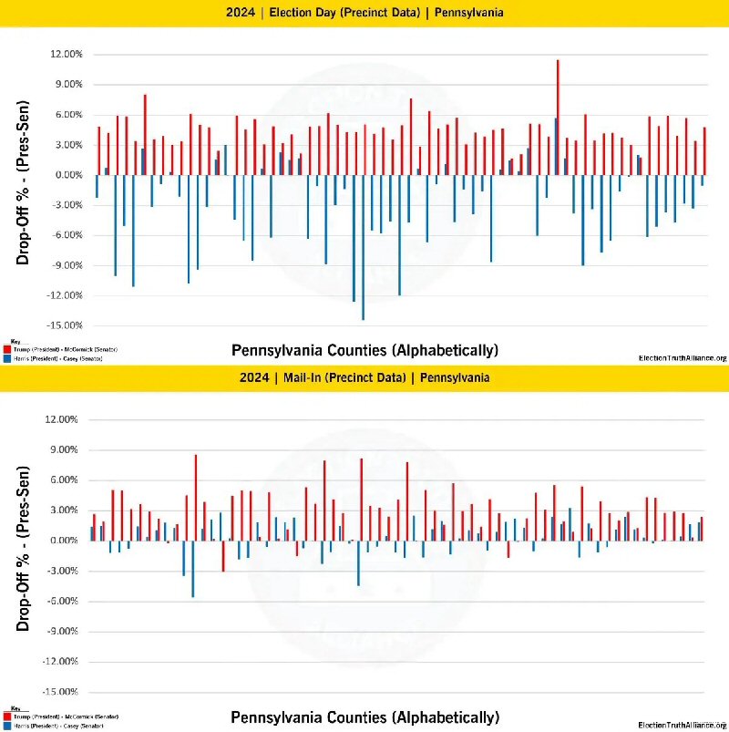 In mail-in voting, Harris and Trump show similar drop-off rates (1.48% vs. 1.96%), which aligns with expected voter behavior. But on Election Day, the numbers diverge sharply: Trump’s drop-off rate skyrockets to 4.51%, while Harris’ plummets to 0.87%.